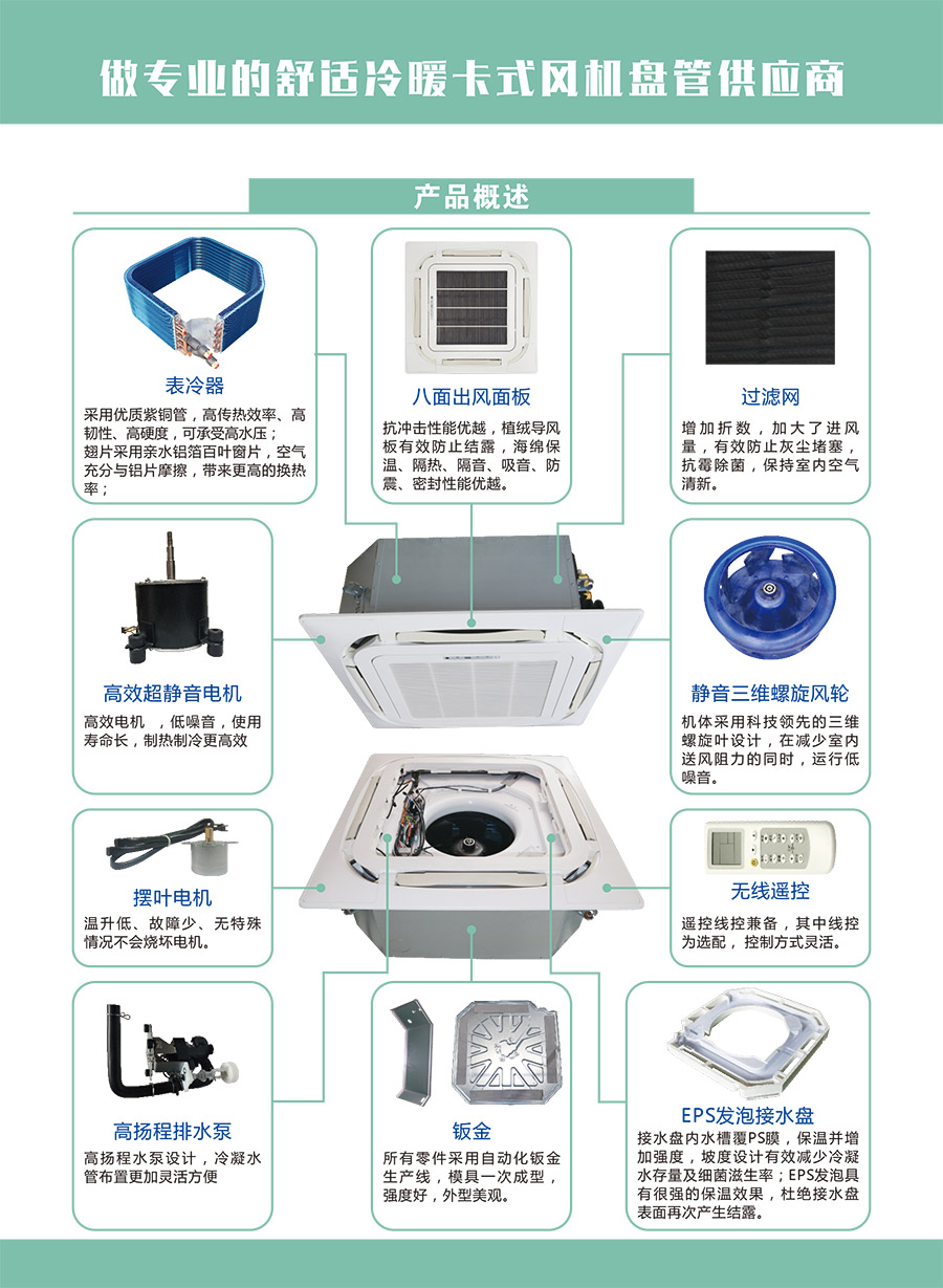 卡风机盘管机组主要由离心风机、盘管换热器等构成,是中央空调系统的末端装置,长效过滤清洁网配防污活动导风板,无需频繁清洗过滤网,清洗简单。为满足不同场合的设计选用。